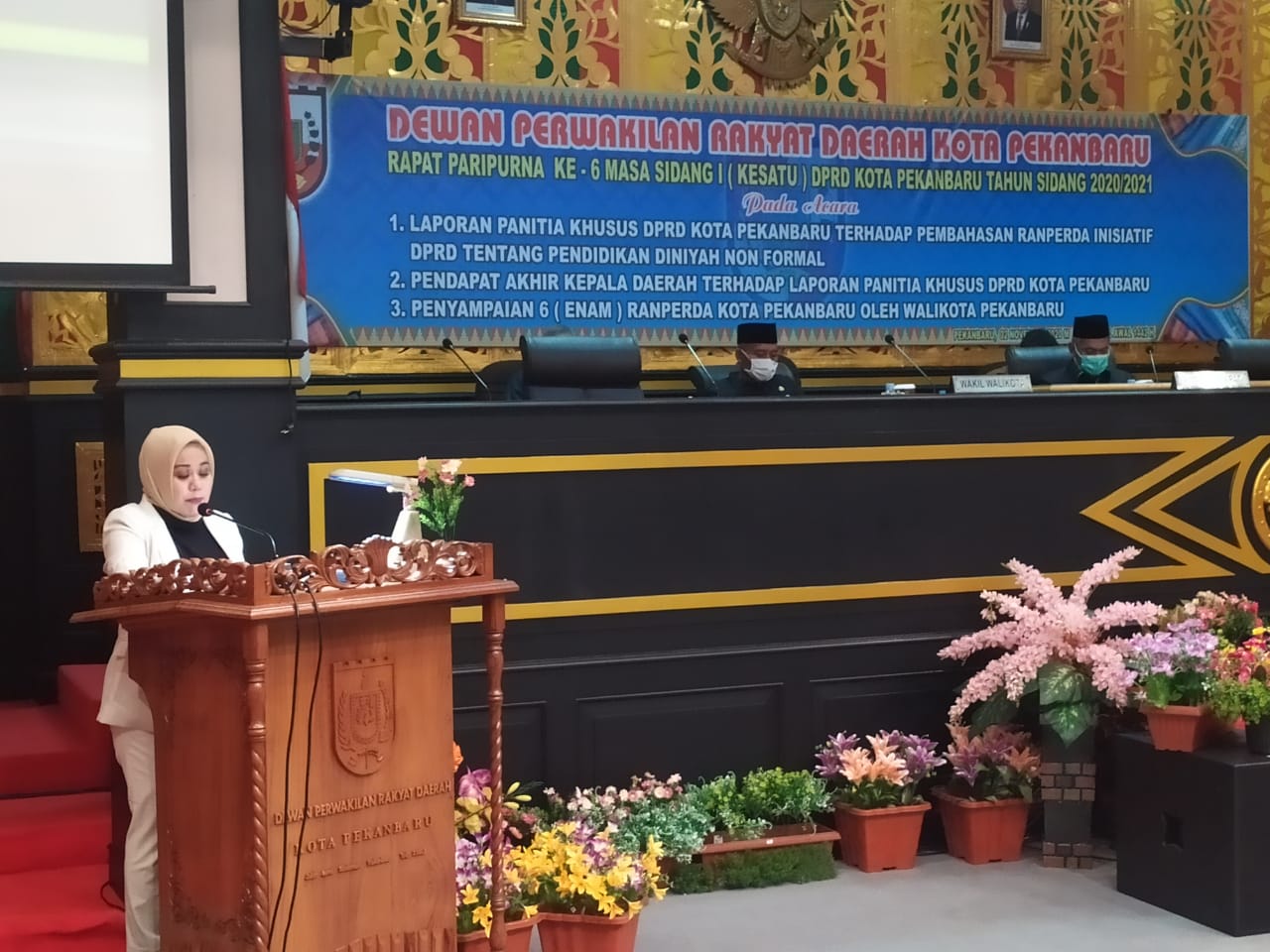 Juru bicara Pansus Ranperda Madrasah Diniyah Takmiliyah Awaliyah (MDTA) atau Pendidikan Diniyah Non Formal, Arwinda saat membacakan hasil kerja Pansus dalam Rapat Paripurna Pengesahan Perda MDTA Pekanbaru, Senin (2/11/2020). *