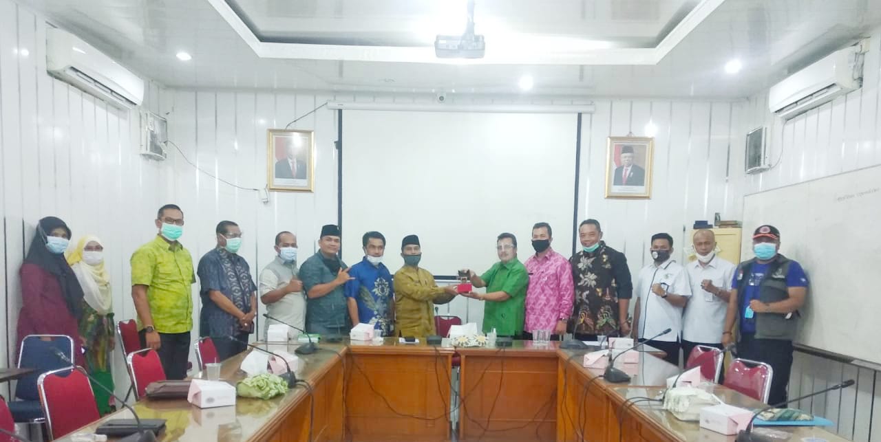 Ketua Pansus III DPRD Pekanbaru Zulkarnain MSi di dampingi Penanggung Jawab Pansus T Azwendi Fajri, menyerahkan plakat kepada perwakilan DPRD Muaro Bungo Jambi, Rabu (11/11/2020).