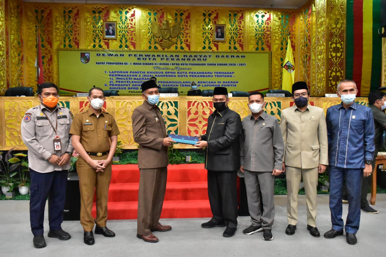 Ketua DPRD Pekanbaru Hamdani SIP (empat dari kanan) menyerahkan draf dua Ranperda yakni Ranperda Inovasi Daerah dan Ranperda BPPD yang sudah dibahas dan disahkan Pansus DPRD, kepada Wakil Walikota Pekanbaru Ayat Cahyadi, dalam paripurna, Senin (15/3/2021) di gedung DPRD Pekanbaru.