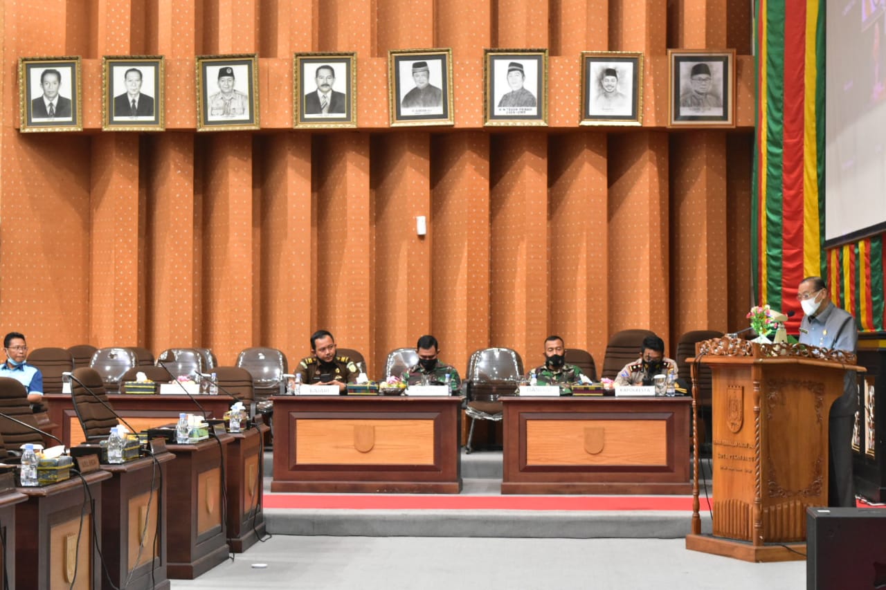 Perwakilan unsur Forkompinda Pekanbaru tampak serius, mengikuti Rapat Paripurna Pandangan Umum Fraksi Ranperda Perlindungan dan dampak Covid-19, Selasa (15/6/2021).