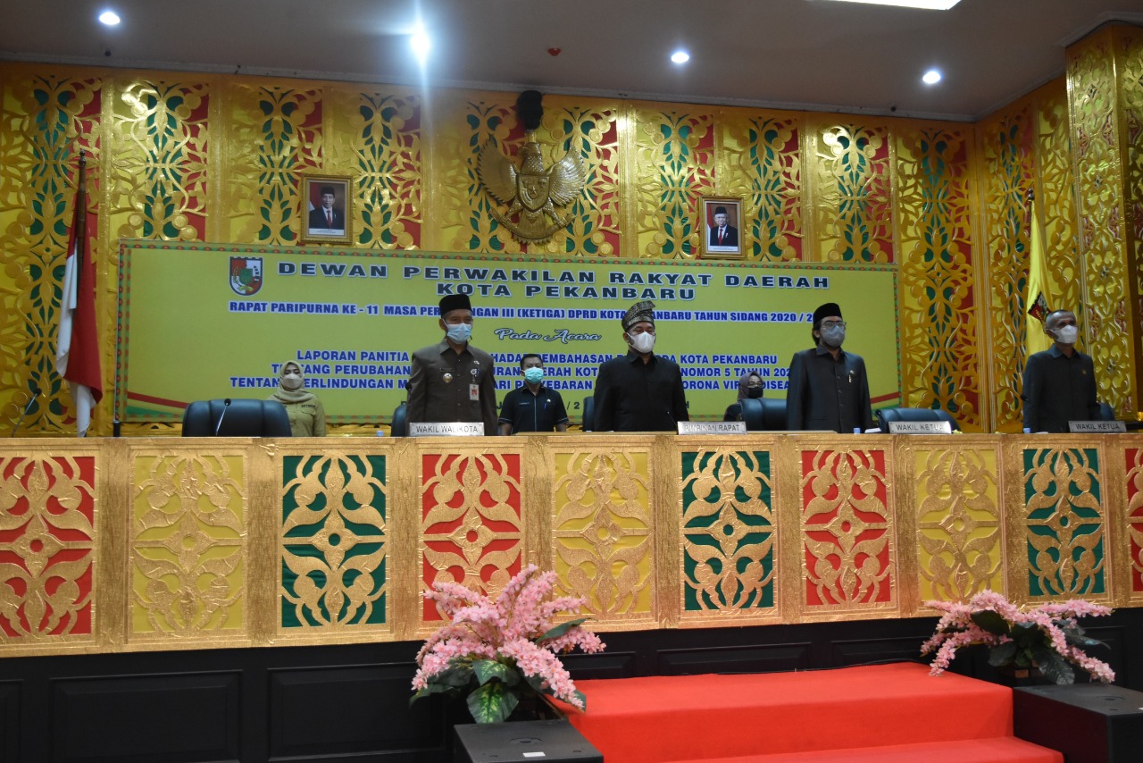 PEKANBARU- DPRD Pekanbaru, akhirnya mengesahkan Perda Perlindungan Masyarakat Dari Penyebaran dan Dampak Covid-19, Senin (12/7/2021). Pengesahan ini langsung dipimpin Ketua DPRD Pekanbaru Hamdani SIP, di dampingi Wakilnya Ir Nofrizal MM dan Ginda Burnama ST.