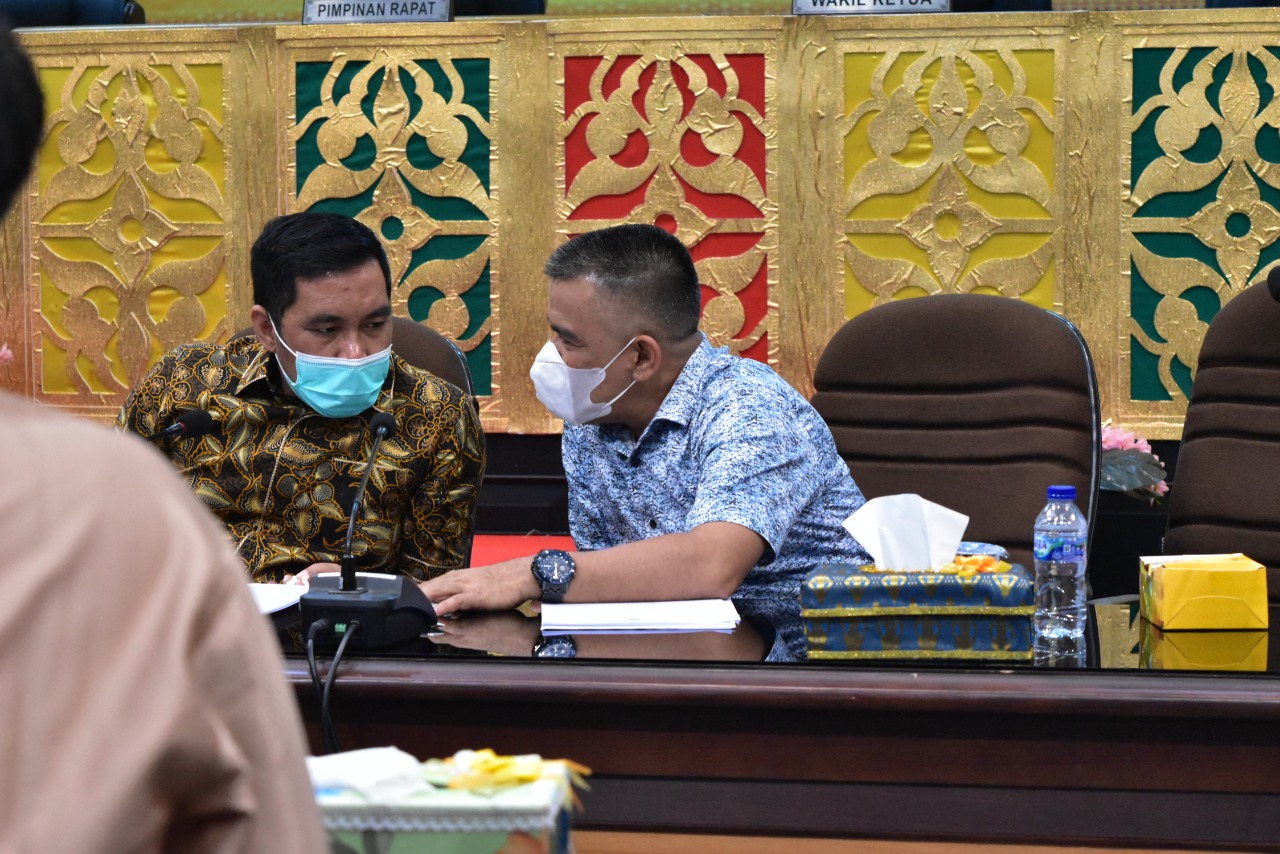 Anggota Pansus Retribusi Sampah DPRD Pekanbaru Roni Pasla (kiri) berkoordinasi dengan anggota Pansus lainnya Doni Saputra, di sela-sela rapat dengan DLHK Pekanbaru, Senin (2/8/2021).