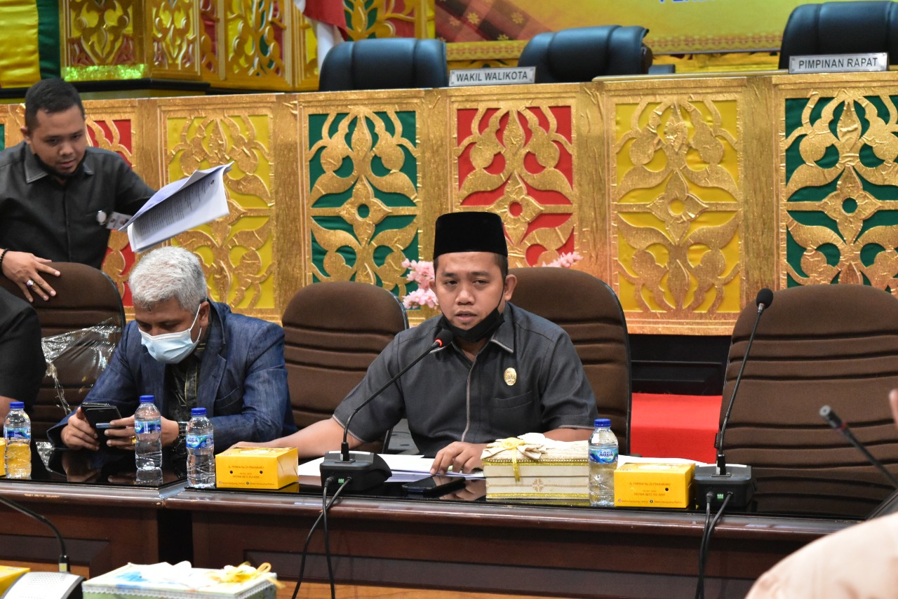 Anggota Pansus Retribusi Sampah DPRD Pekanbaru Doni Saputra (paling kanan/baris depan), bertanya kepada DLHK Pekanbaru, soal retribusi sampah saat rapat, Senin (2/8/2021) di Ruang Paripurna DPRD.