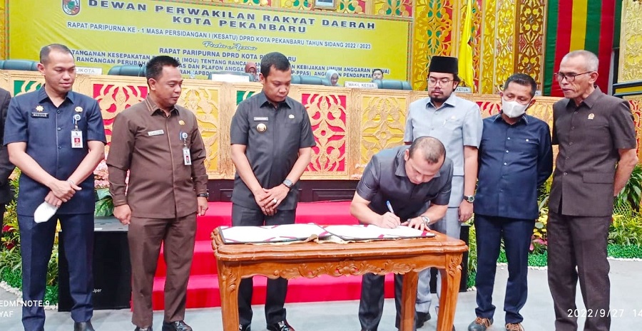 Ketua DPRD Pekanbaru Muhammad Sabarudi ST, di dampingi Pj Wali Kota Muflihun dan Wakil Ketua DPRD, menandatangani MoU KUA PPAS APBD Perubahan 2022, saat Rapat Paripurna, Selasa (27/9/2022).