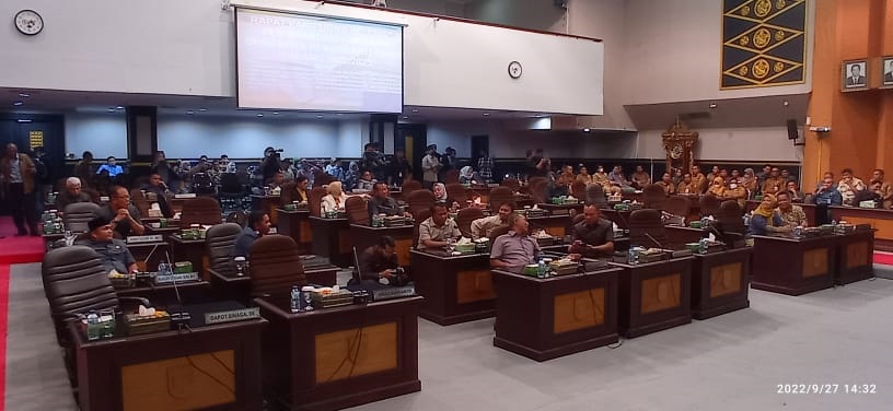 PEKANBARU- DPRD Pekanbaru akhirnya menggelar Rapat Paripurna MoU KUA PPAS APBD Perubahan 2022, Selasa (27/9/2022). Rapat dipimpin Ketua DPRD Pekanbaru Muhammad Sabarudi ST, di dampingi tiga wakilnya Ginda Burnama ST, T Azwendi Fajri SE, Ir Nofrizal MM, serta para anggota dewan lainnya.