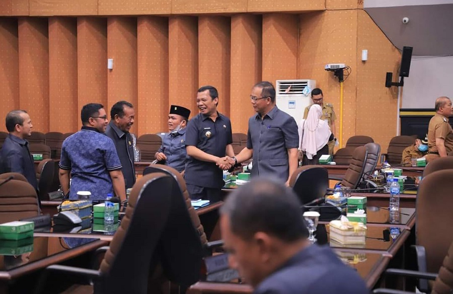 Anggota DPRD Pekanbaru Robin Eduar (kanan) bersalaman dengan Pj Wali Kota Pekanbaru, sesaat dimulainya Rapat Paripurna MoU KUA PPAS APBD Perubahan 2022, Selasa (27/9/2022).