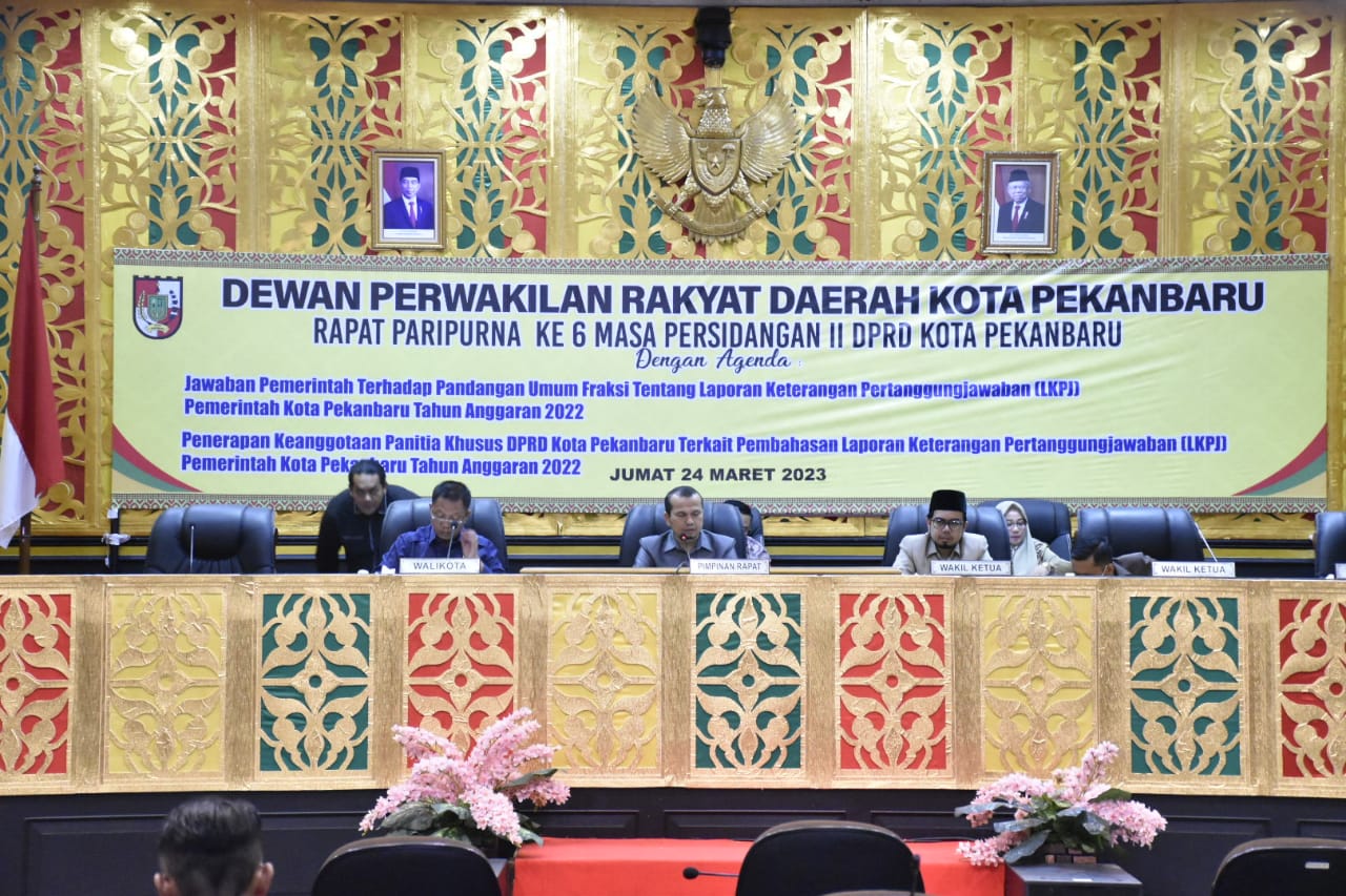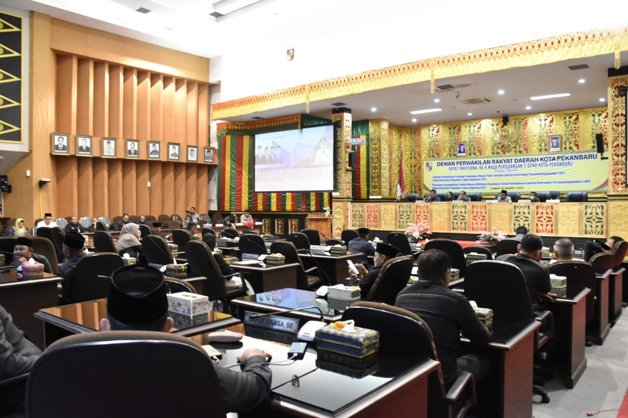 PEKANBARU- DPRD Pekanbaru menggelar Rapat Paripurna Jawaban Pemerintah Tentang Pandangan Fraksi, terkait LKPj Wali Kota Pekanbaru tahun 2022, Jumat (24/3/2023) di ruang Paripurna DPRD.