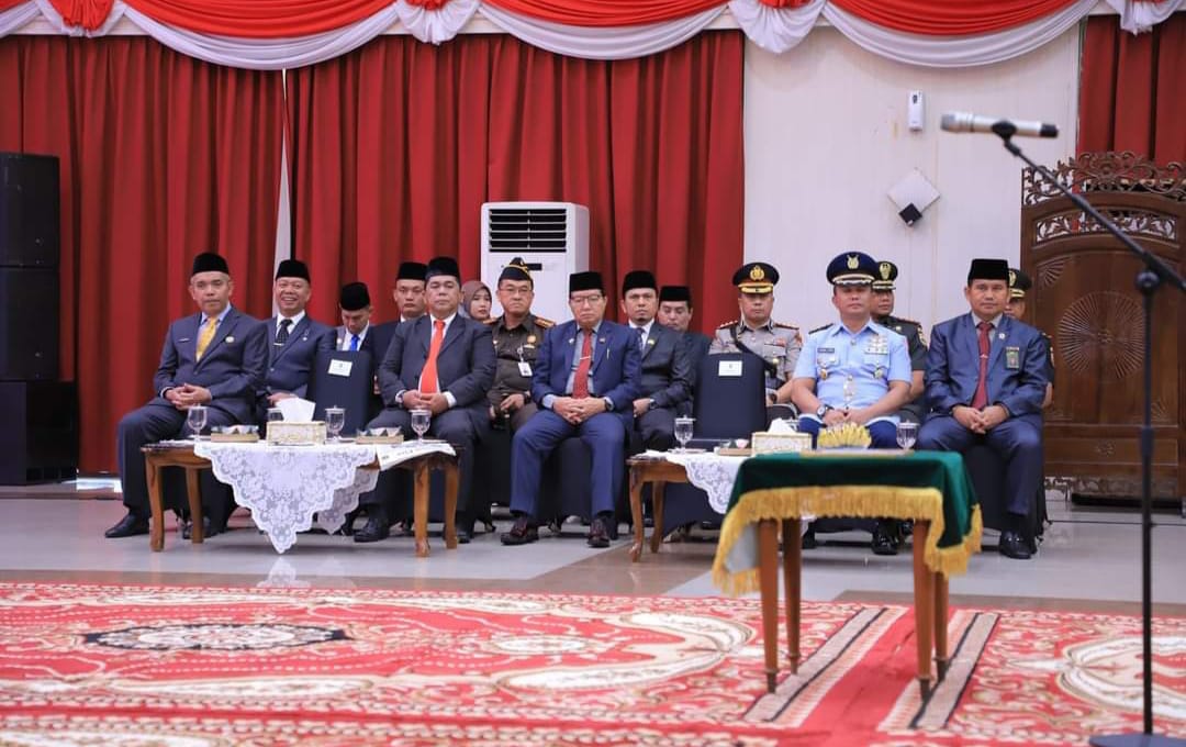 Ketua DPRD Pekanbaru Muhammad Sabarudi ST (baris kedua/tengah) saat menghadiri pengambilan sumpah dan menerima SK Pj Wali Kota Pekanbaru Muflihun, di Gedung Daerah Riau, Selasa (23/5/2023).