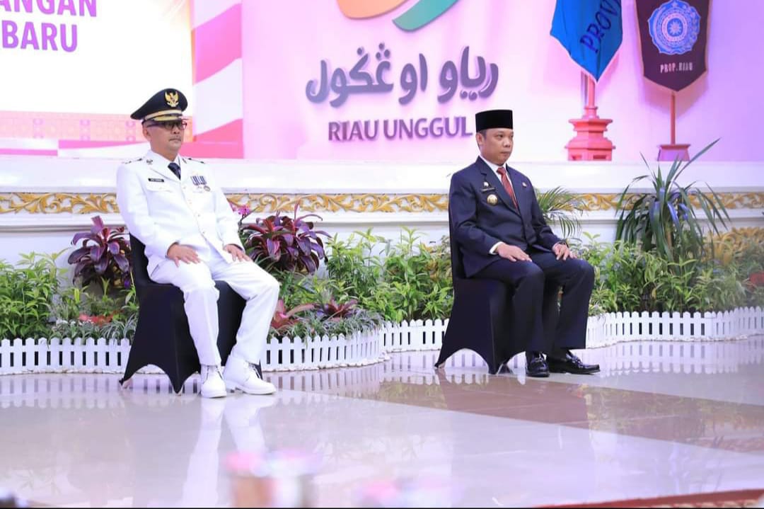 Detik-detik Muflihun (kanan) saat pengambilan sumpah dan menerima SK sebagai Pj Wali Kota Pekanbaru, di Gedung Daerah Riau, Selasa (23/5/2023).