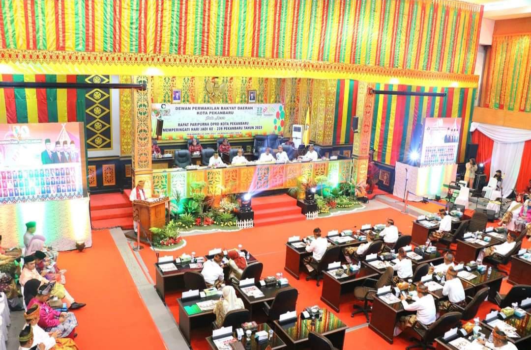 PEKANBARU- DPRD Pekanbaru menggelar Rapat Paripurna Istimewa HUT Kota Pekanbaru ke-239, Jumat siang (23/6/2023). Paripurna ini dipimpin Ketua DPRD Pekanbaru Muhammad Sabarudi ST, di dampingi Wakil Ketua Ginda Bernama ST MT, T Azwendi Fajri SE, Ir Nofrizal MM, serta semua anggota dewan lainnya.