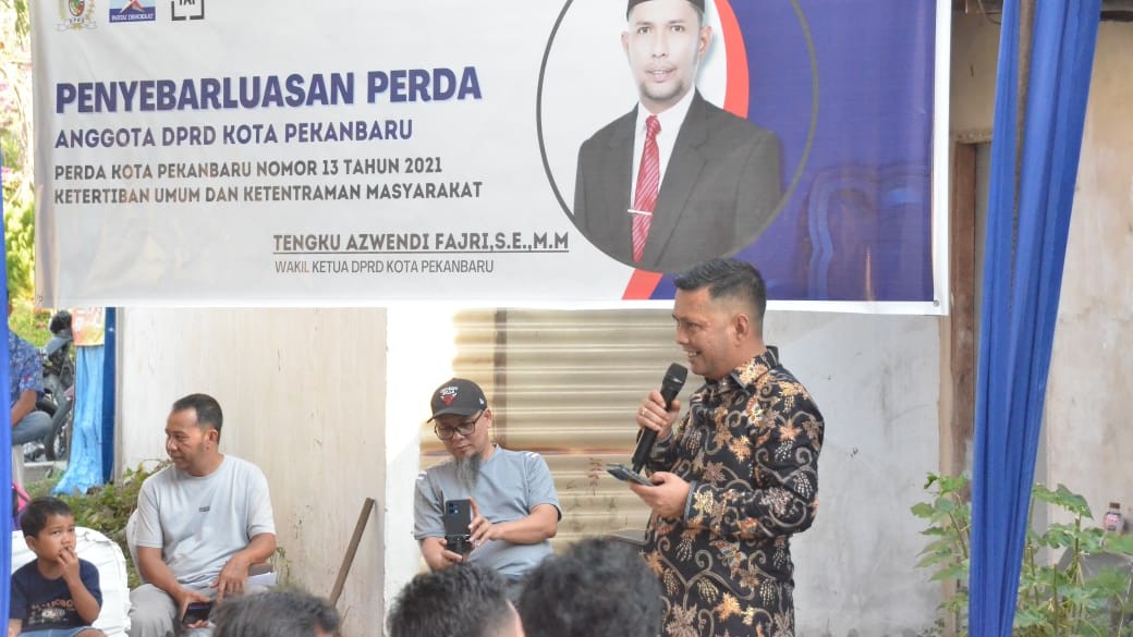 PEKANBARU — Upaya mewujudkan Kota Pekanbaru yang tertib, aman, dan nyaman kembali diperkuat DPRD melalui kegiatan Penyebarluasan Peraturan Daerah (Perda) yang digelar Wakil Ketua DPRD Kota Pekanbaru, Tengku Azwendi Fajri, di Jalan Kusuma, Kelurahan Simpang Tiga, Kecamatan Bukit Raya, Kamis (27/11/2025).