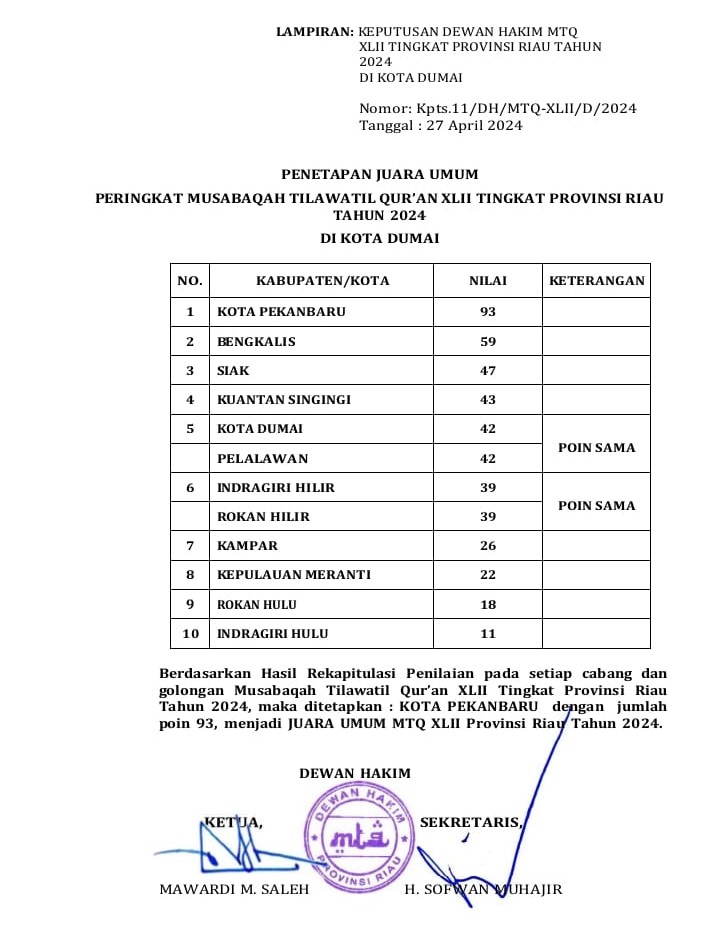 PEKANBARU - Kota Pekanbaru kembali mengukir prestasi membanggakan di ajang Musabaqah Tilawatil Quran (MTQ) ke-42 tingkat Provinsi Riau. Berlangsung di Kota Dumai, perjuangan kafilah Pekanbaru selama sepekan membuahkan hasil manis dengan raihan juara umum, mengungguli 11 kabupaten dan kota lainnya.