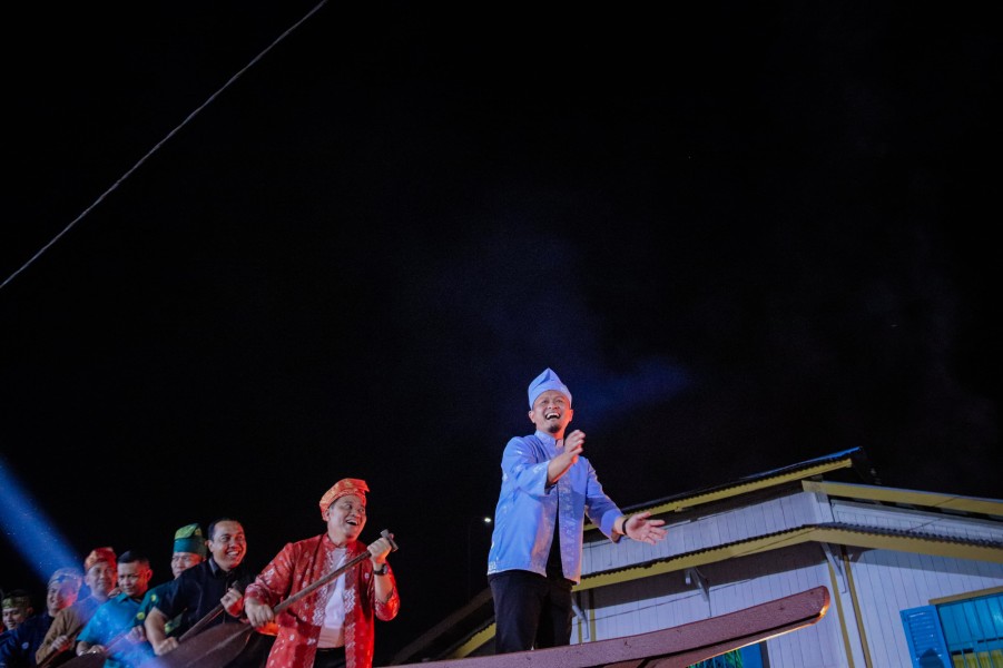 Agung bersama pejabat Forkopimda, menirukan gerakan dalam lomba Pacu Jalur dari Kabupaten Kuantan Singingi yang tengah viral tersebut.