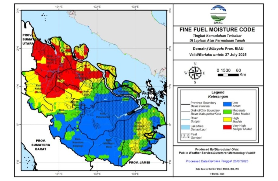 "Cuaca pagi hari umumnya cerah berawan, namun hujan diprakirakan terjadi mulai siang hingga dini hari di berbagai kabupaten. Ini sangat membantu meredam potensi kebakaran lahan," ujar Indah, Minggu pagi (27/7).