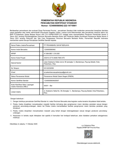 Dengan terbitnya pencabutan Sertifikat Standar tersebut, lanjut Devi, maka Perizinan Berusaha atas kegiatan usaha tersebut dinyatakan tidak berlaku.