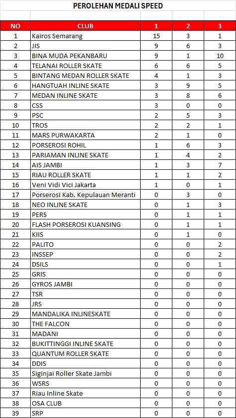 Pada kategori speed, Kairos Semarang tampil dominan dengan 15 emas, 3 perak, dan 1 perunggu. Disusul Jambi Inline Skate (JIS) dengan 9 emas, 6 perak, dan 3 perunggu, serta Bina Muda Pekanbaru dengan 9 emas, 1 perak, dan 10 perunggu.