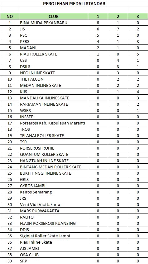 Sementara di kategori standar, tuan rumah Bina Muda Pekanbaru menunjukkan kekuatannya dengan 8 emas dan 1 perak. JIS berada di posisi kedua dengan 6 emas, 7 perak, dan 2 perunggu, diikuti Payakumbuh Skate Club (PSC) dengan 5 emas dan 1 perak.