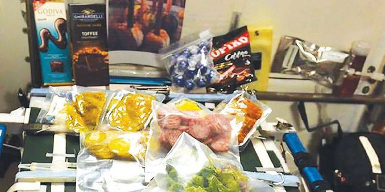 Makanan itu disajikan dalam food tray dan tersambung dengan middeck storage locker. Program International Space Station (1998-2004), mayoritas makanan yang bisa dibawa berbentuk makanan beku dan makanan yang di-thermostabilisasi. Tak hanya makanan, minuman pun sudah didehidrasi menjadi bentuk serbuk.